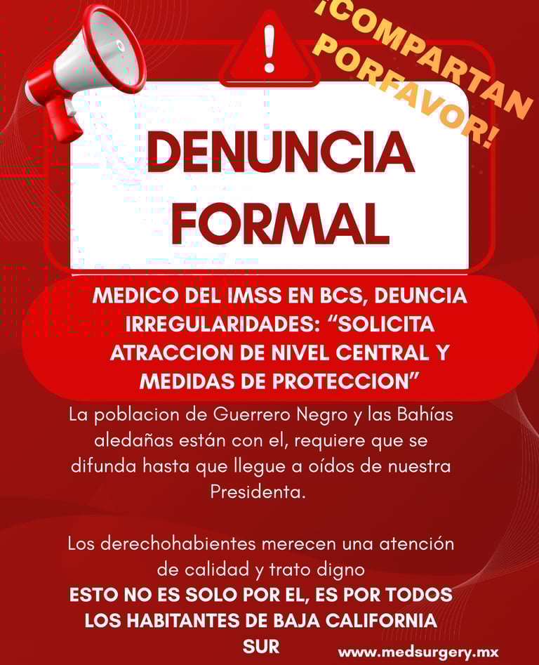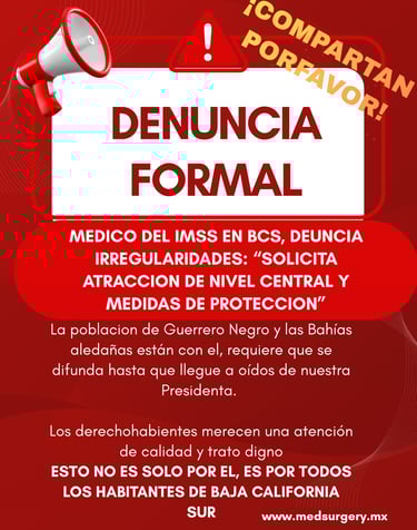 Médico del IMSS en Baja California Sur, Denuncia "Irregularidades", Solicita Atracción del Caso por Nivel Central y Medidas de Protección.